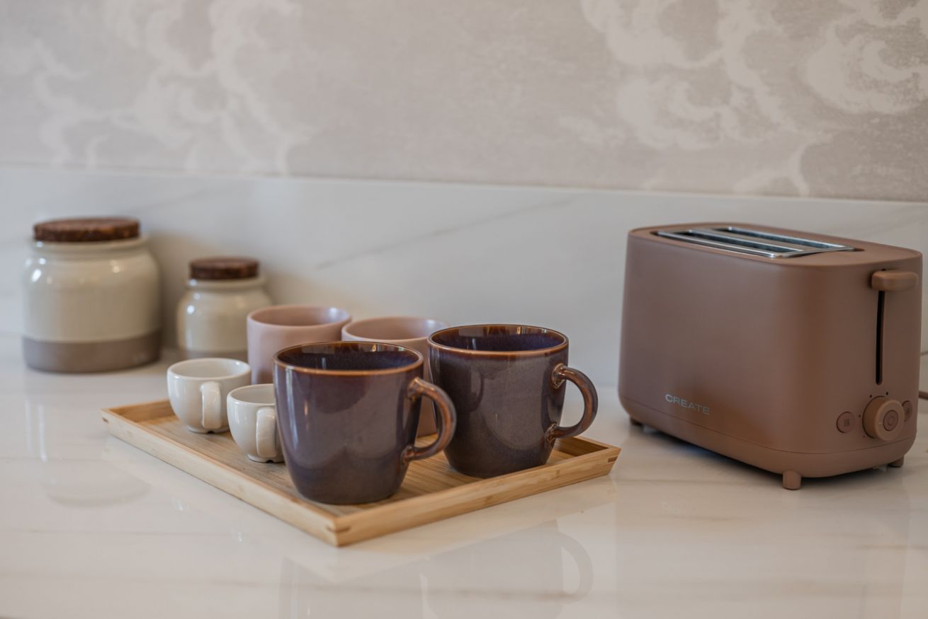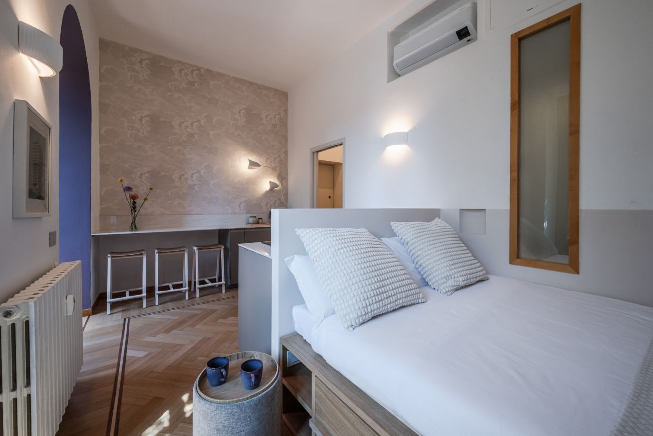Il cuore dell’appartamento è un open space luminoso dove cucina a vista e zona living dialogano con naturalezza: la consolle da pranzo accompagna momenti di convivialità, mentre la zona notte offre un comodo letto matrimoniale, ideale per coppie e business traveller. All’occorrenza, una struttura estraibile si apre trasformandosi in un letto singolo aggiuntivo, perfetto per ospitare anche piccoli nuclei familiari con la massima praticità. La Smart TV completa l’esperienza con intrattenimento immediato e comfort contemporaneo.