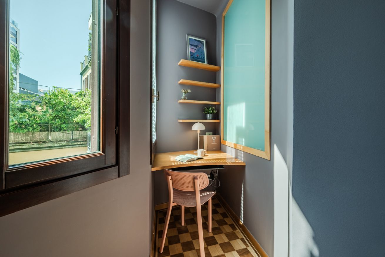 Un angolo smart working dedicato, discreto ma perfettamente integrato, permette di lavorare in tranquillità senza rinunciare allo stile.