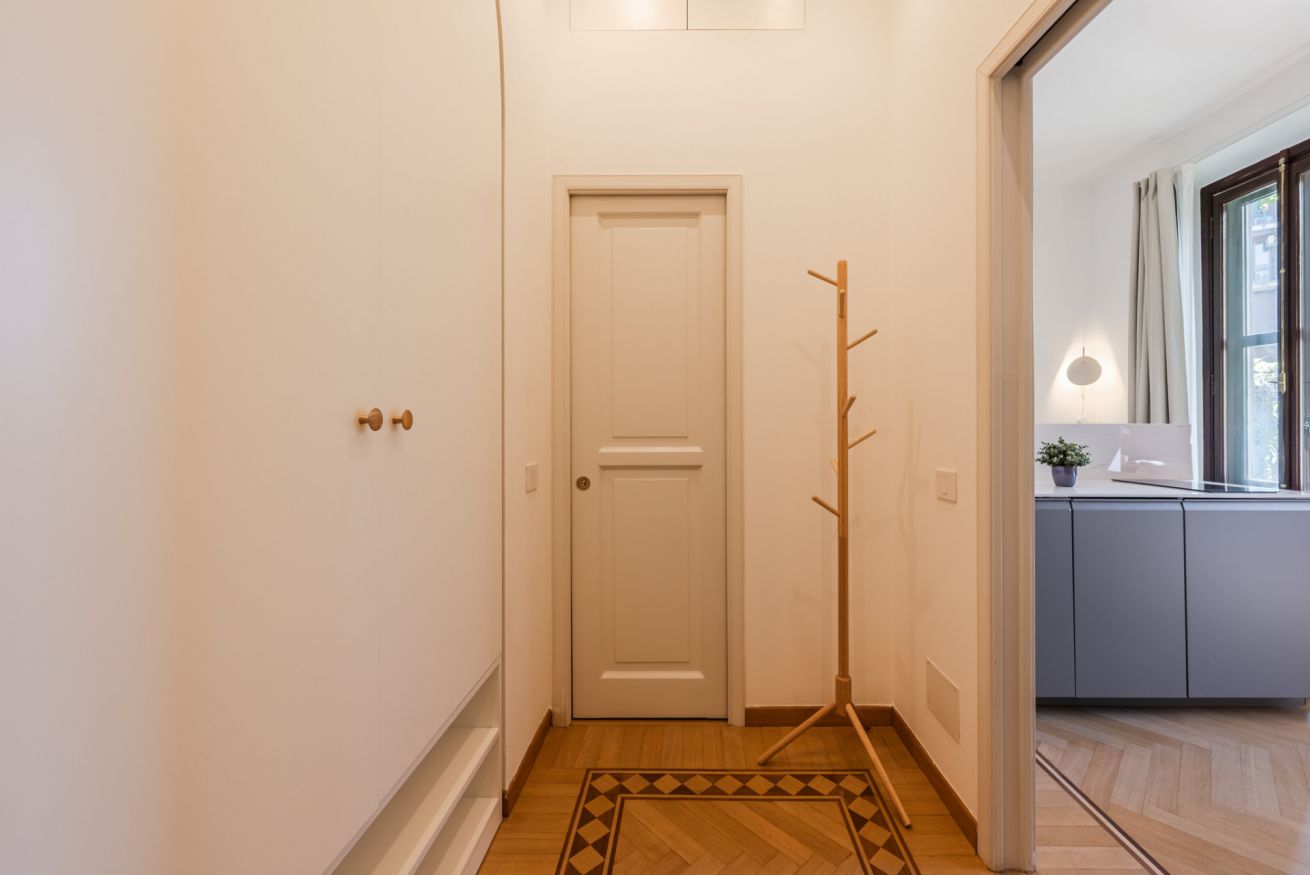 Varcata la soglia, un ingresso ordinato e funzionale accoglie gli ospiti con un ampio armadio su misura, pensato per mantenere l’ambiente sempre essenziale e armonioso.